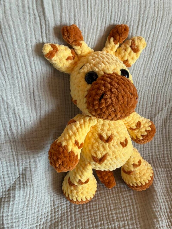 Diese liebevoll handgefertigte Giraffe aus weichem Chenillegarn bringt mit ihrem fröhlichem Gelb und den typischen braunen Flecken Wärme und Farbe in jedes Kinderzimmer. Die großen Knopfaugen verleihen ihr einen freundlichen Ausdruck, während die beweglichen Gliedmaßen (nach oben und unten) perfekt zum Kuscheln und Spielen geeignet sind.