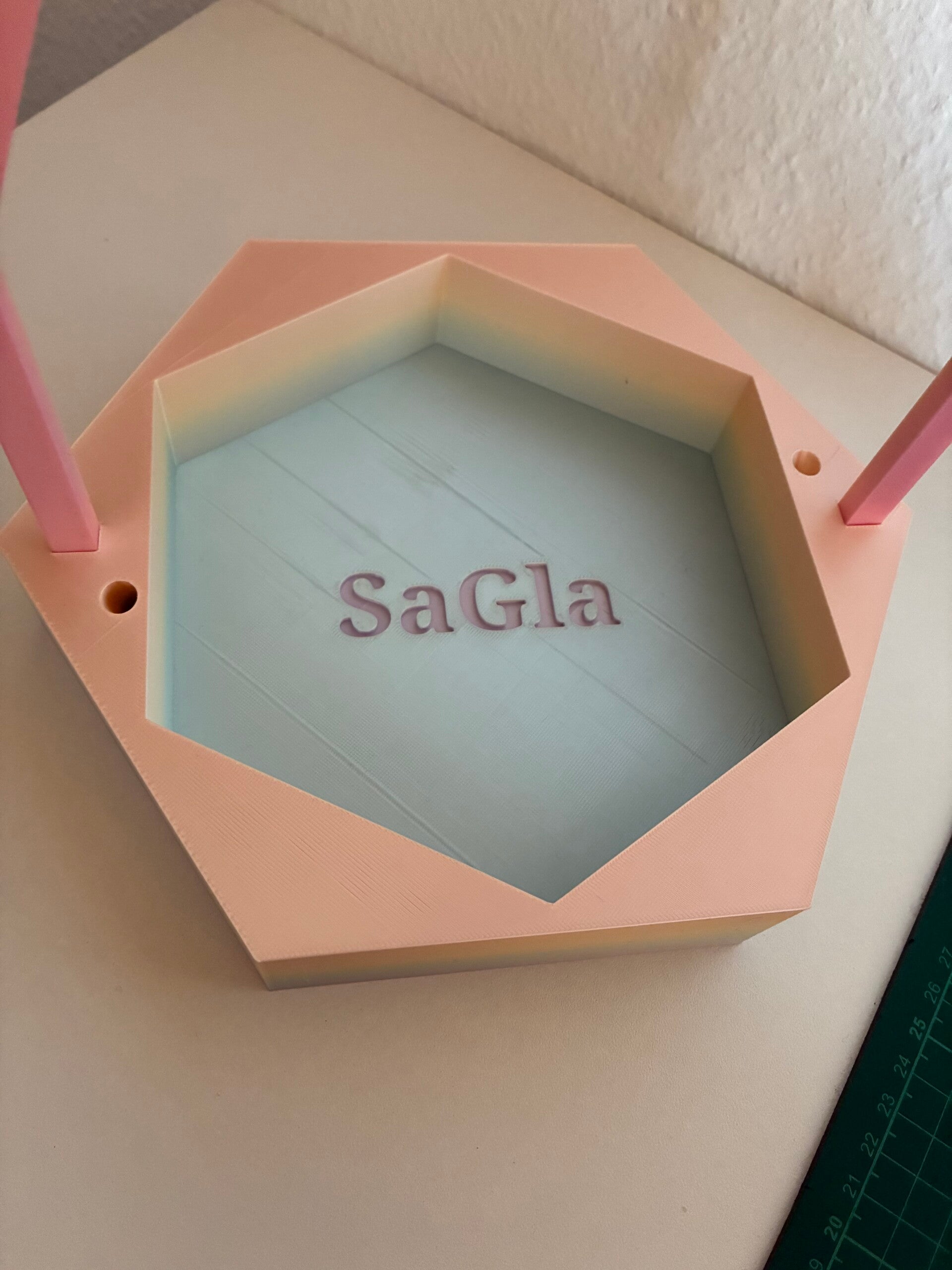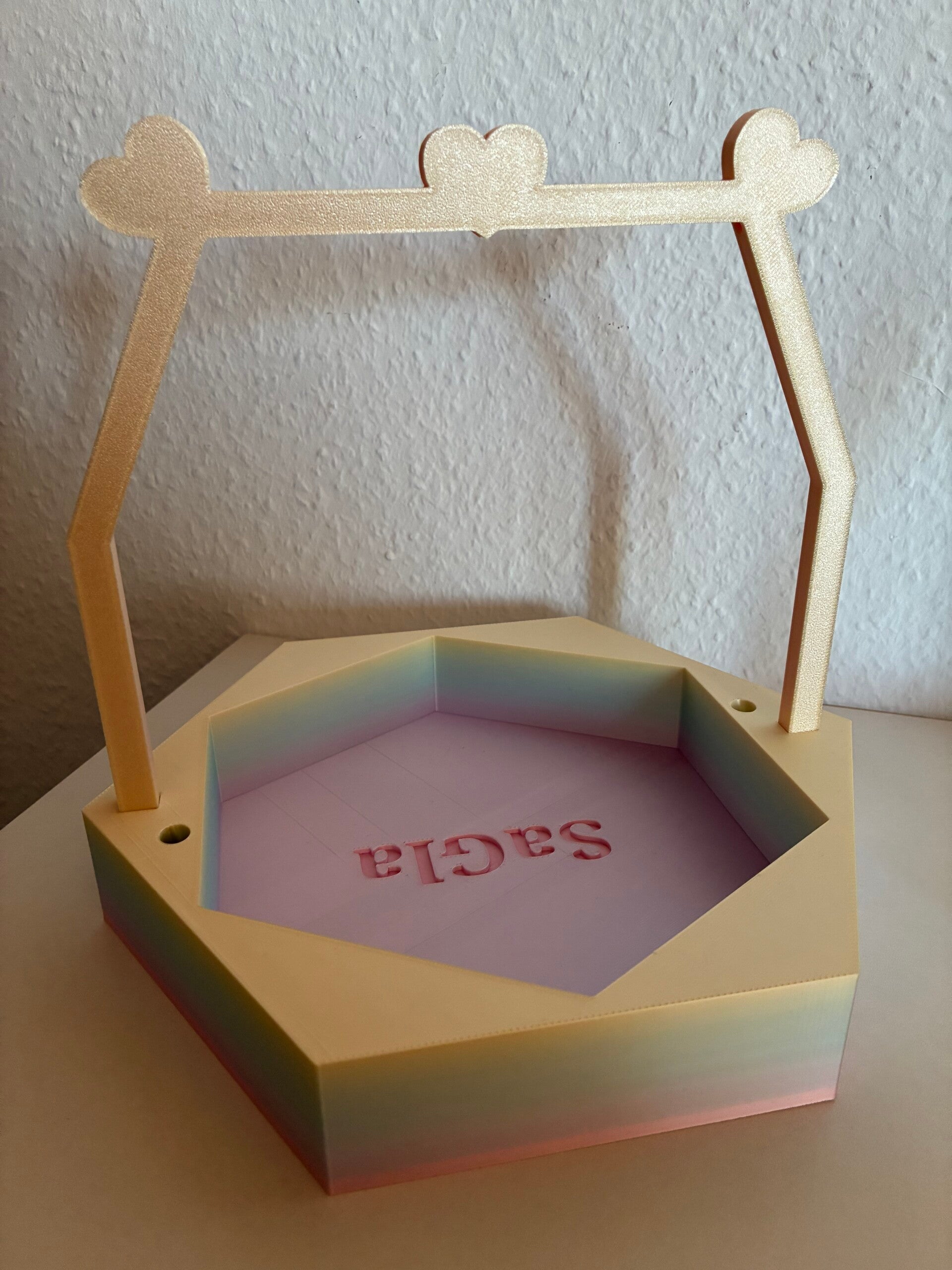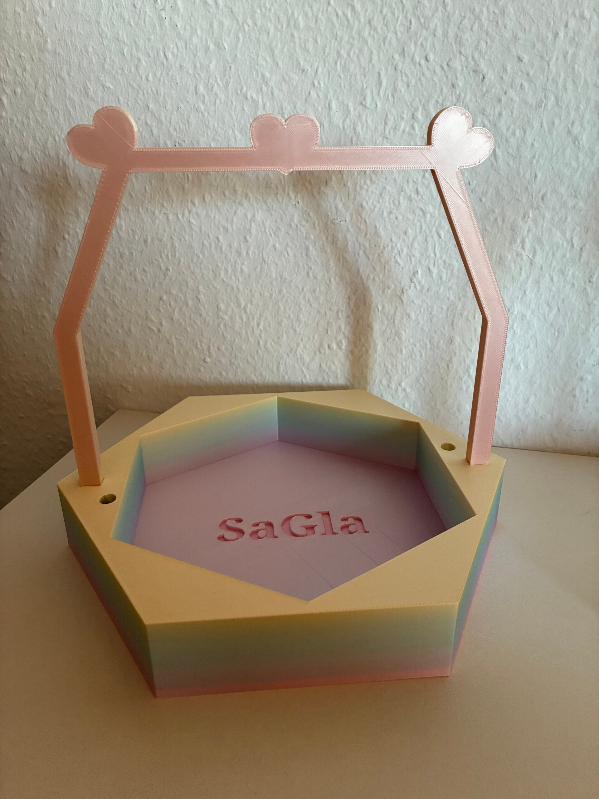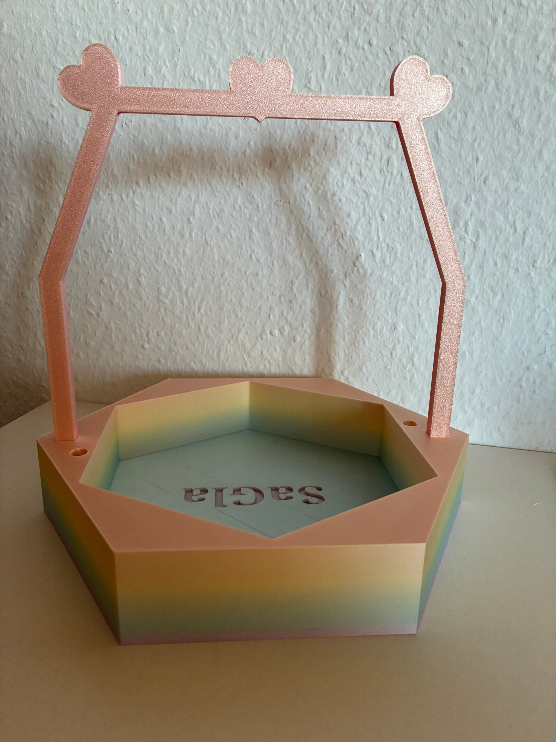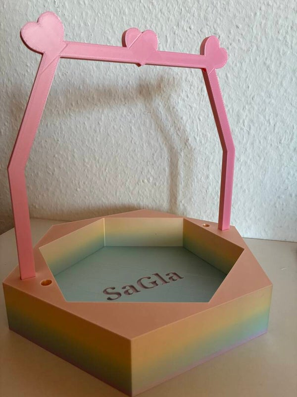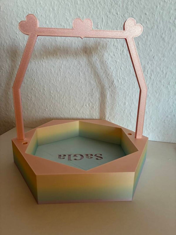 Dieses einzigartige Wollkörbchen wurde von mir selbst entworfen und mit viel Liebe zum Detail im 3D-Druckverfahren gefertigt. Besonders hervorzuheben sind die dekorativen Herz-Elemente mit integrierten Fadenläufen – praktisch und gleichzeitig ein echter Hingucker.